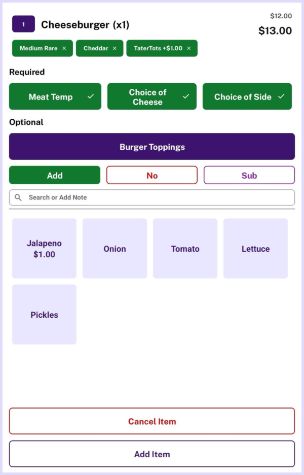 Handwritten Modifier Notes are no longer displayed on guest-facing receipts. Notes can be used as an internal communication tool if needed. All other Modifiers (Add, No, Sub) will be visible on guest-facing receipts.