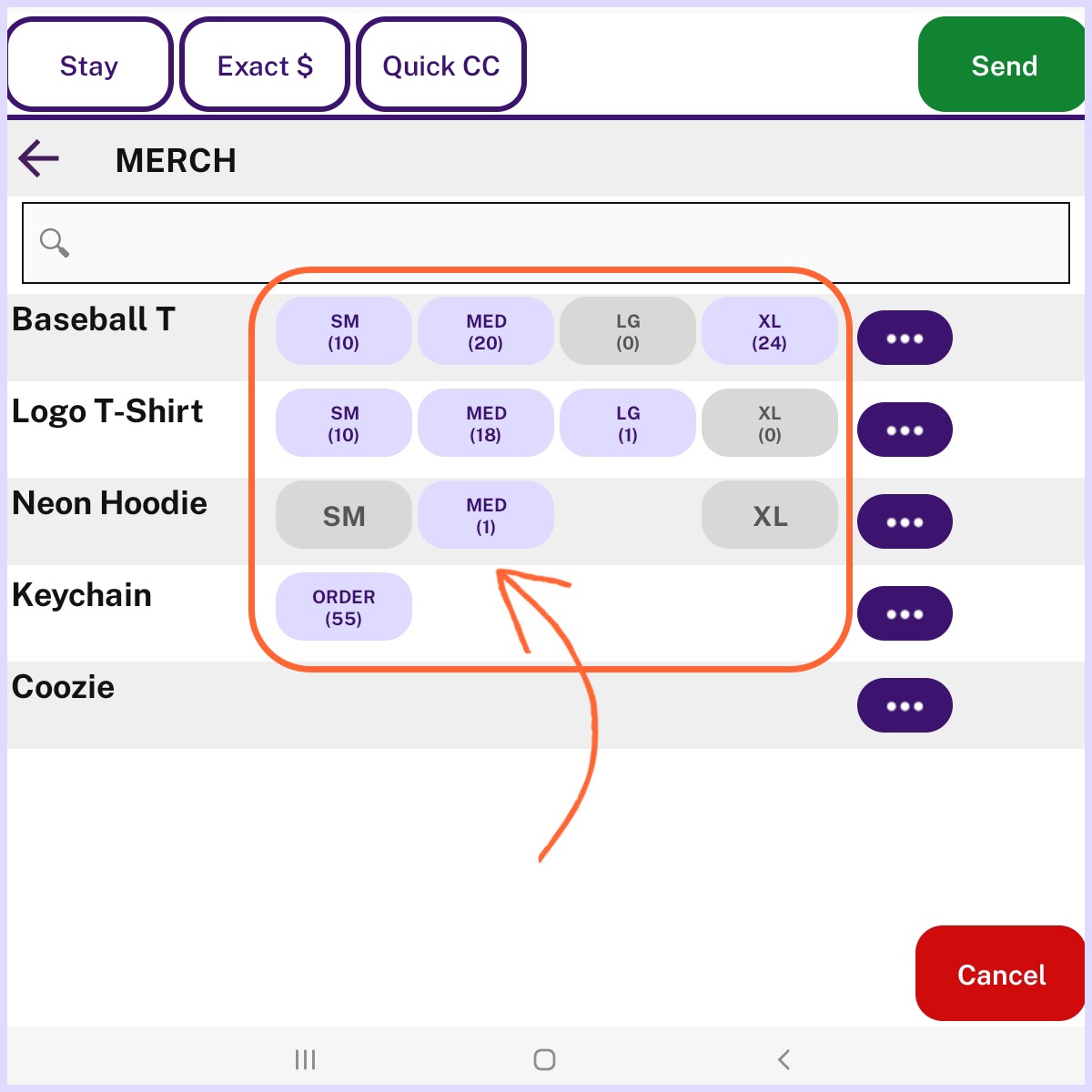 Enabling the Show Inventory counts on size buttons Location Preference adds the ‘Quantity in Stock’ count of the Inventory Items’ Unit Sizes to the buttons used to order the items in Arryved Service.