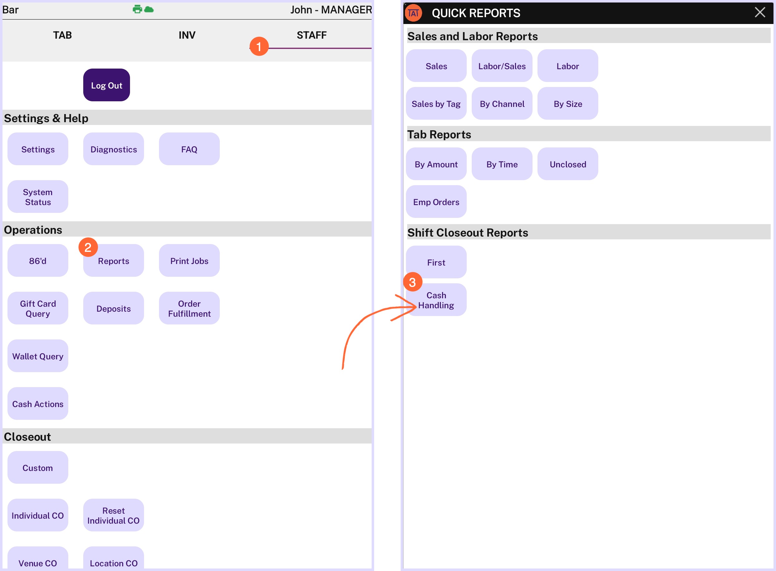 Enabling the Display Cash Handling Summary in Location Closeout (CO) Location Preference adds the ‘Cash Handling’ button under the ‘Reports’ button on the STAFF screen in Arryved Service. Behind the Cash Handling button is the Cash Handling Summary which shows a record of your Cash Actions and cash sales for the day.