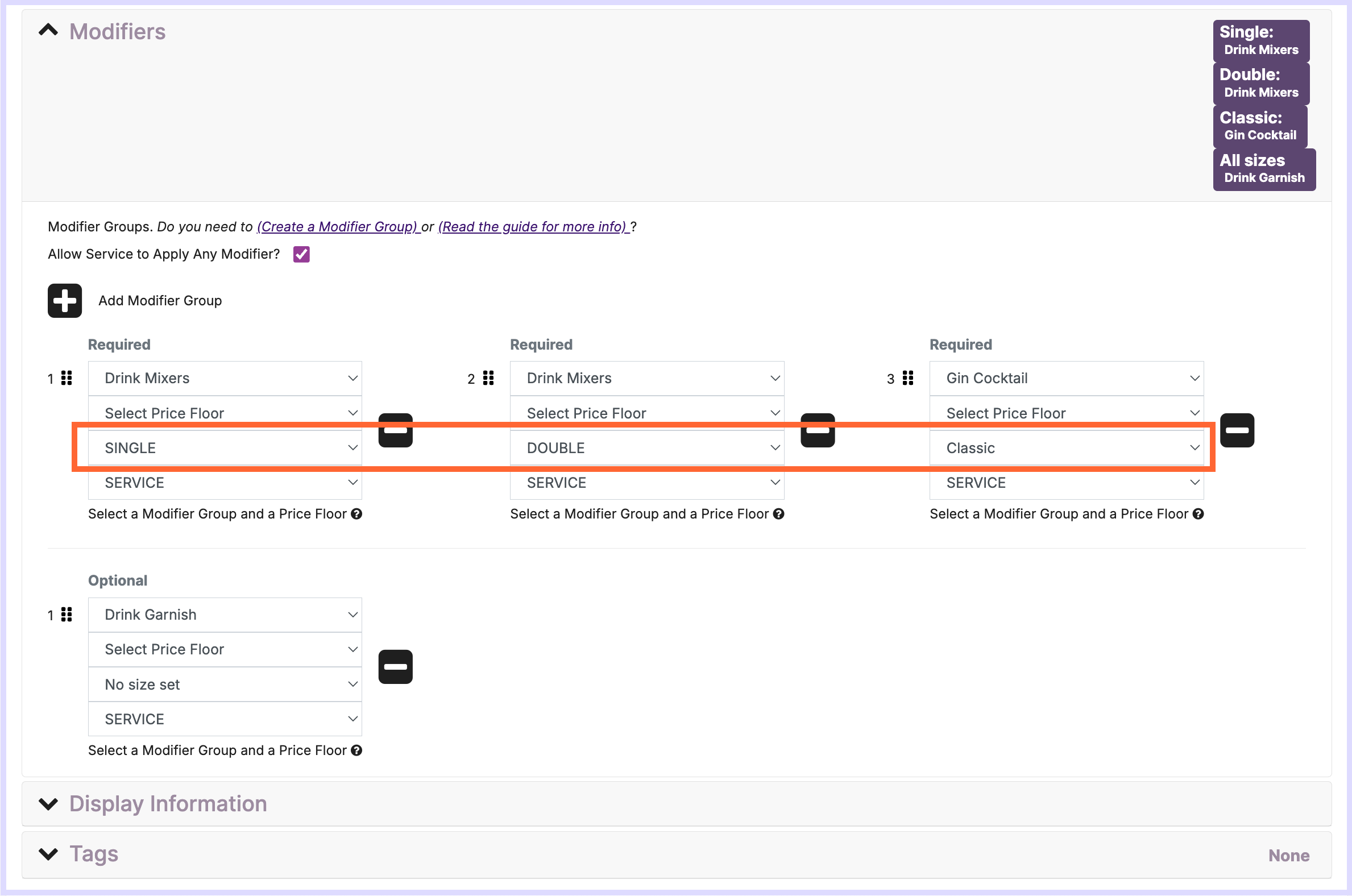 You can apply Modifier Groups to specific Sizes of an Item. Maybe you want your classic cocktail size to have cocktail Modifiers while your 2 oz and 4 oz sizes have well mixers and garnish Modifiers.
