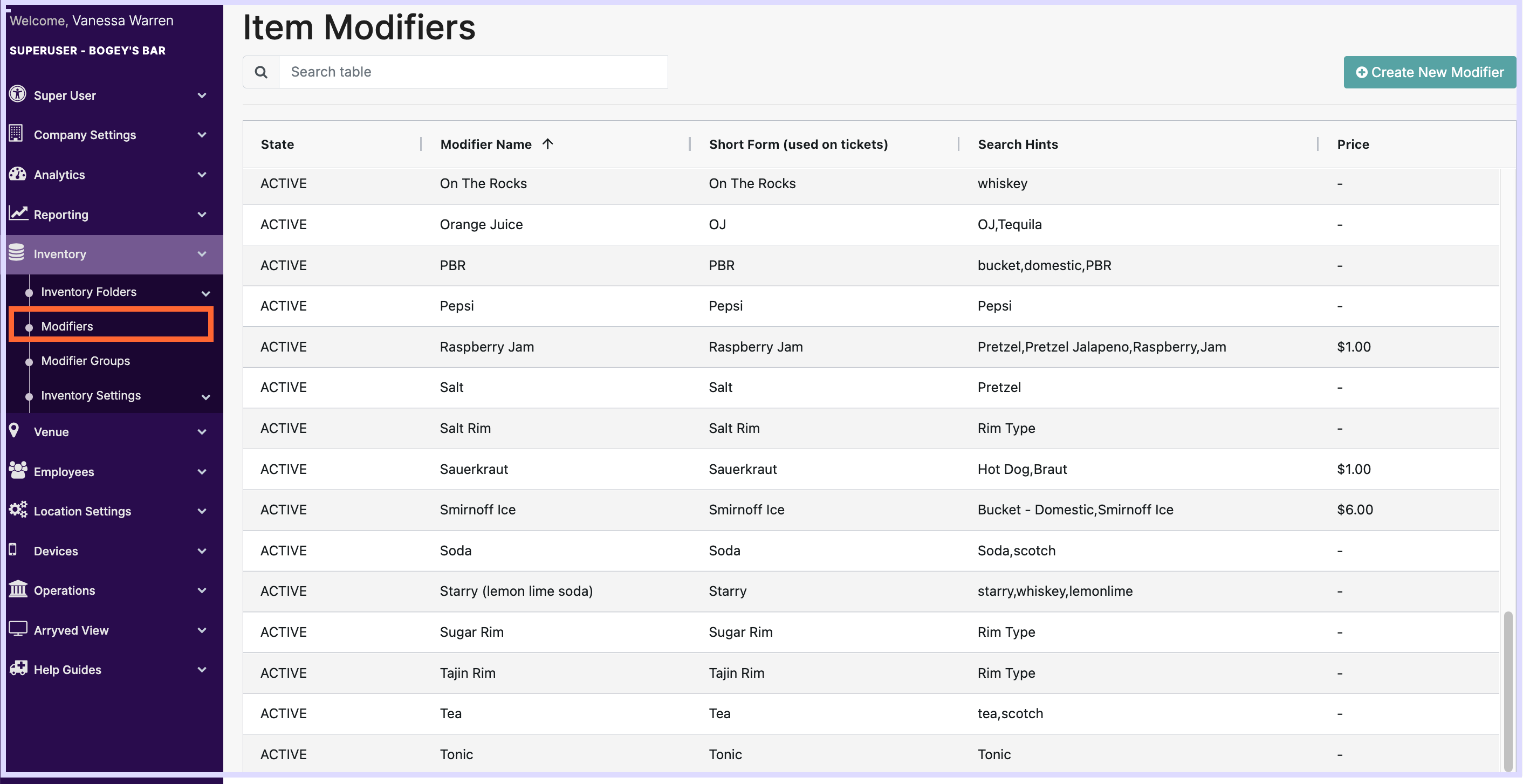 Since these are typically set-in-stone recipes, you may not need any Modifiers for them, but if you do offer any modifications, be sure to create those as Item Modifiers. Here are some examples of possible modifications for house cocktails:
