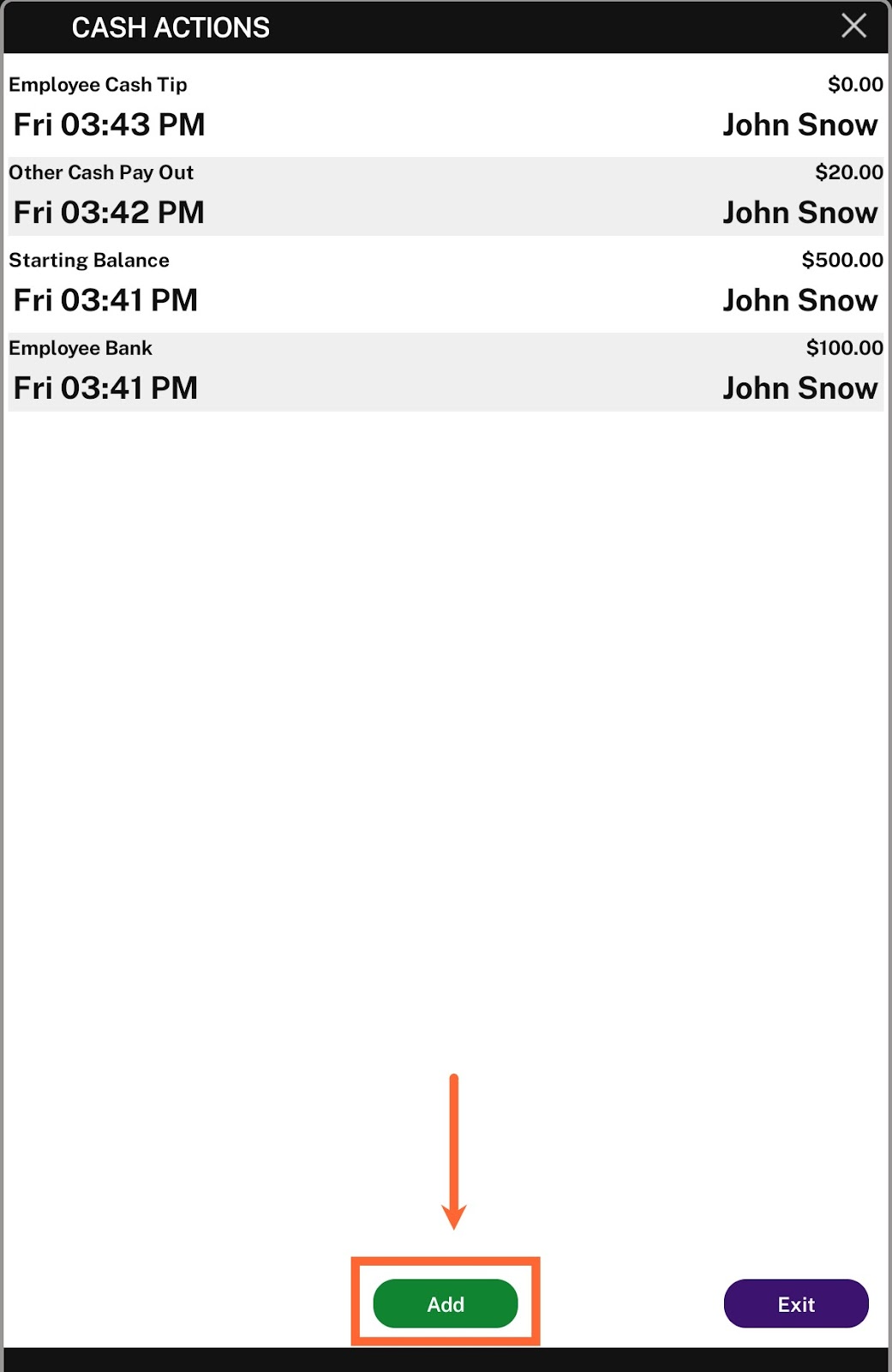 Cash Actions is a tool located on the STAFF screen in Arryved Service used to manually record actions handling cash. The Cash Actions tool has 3 main uses: