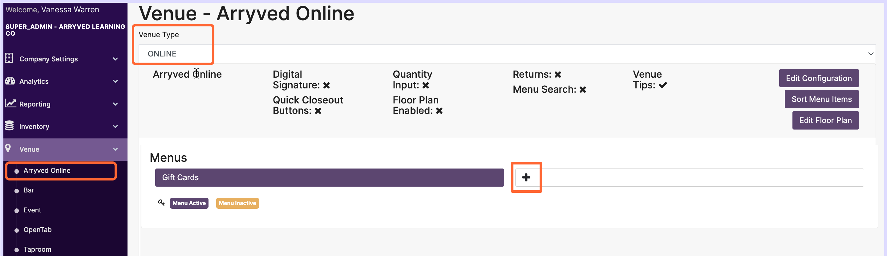 If this is your first time with Arryved Online, first click Venue + to add the new Online Store Venue you just created in the prerequisites.