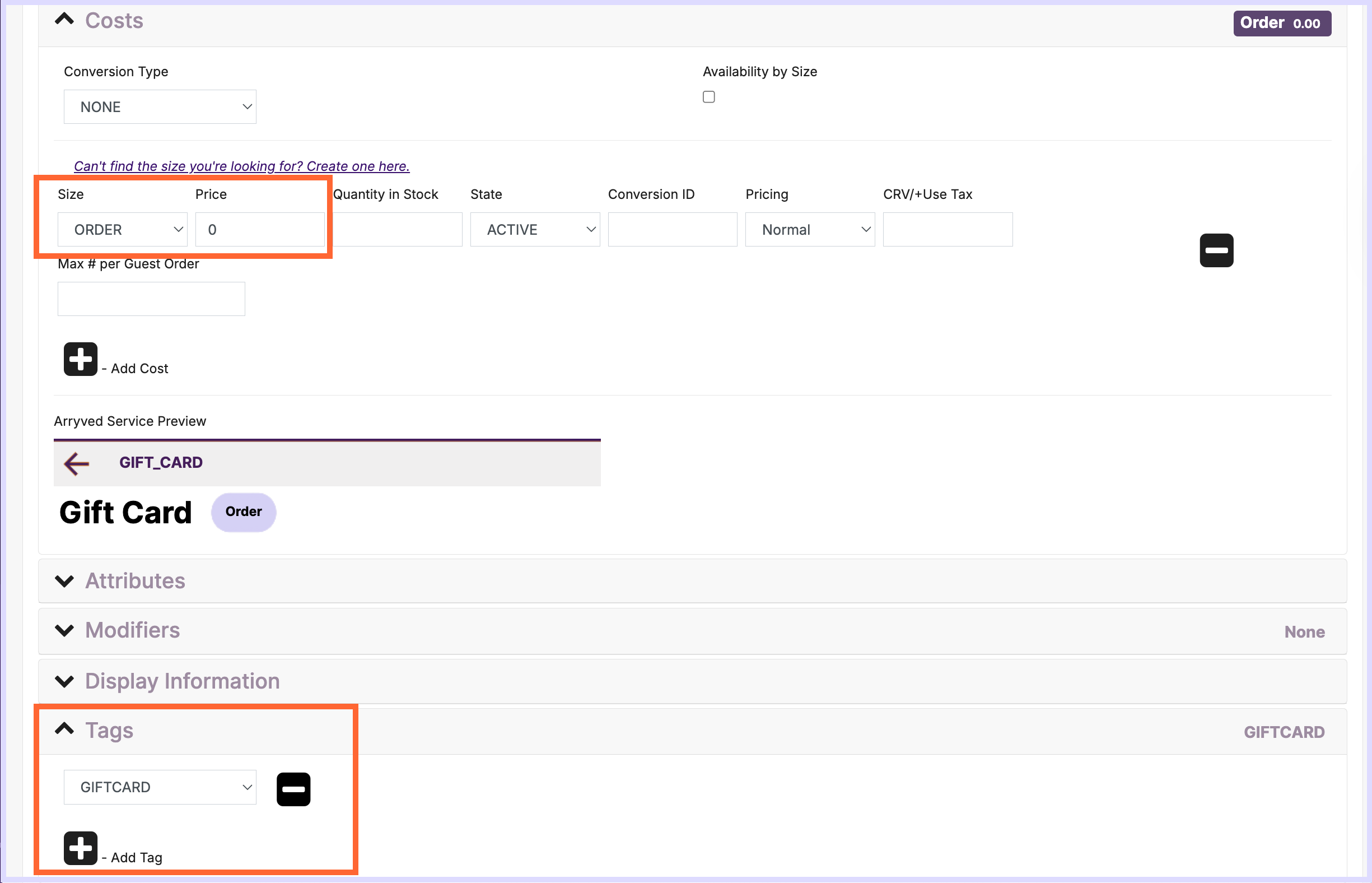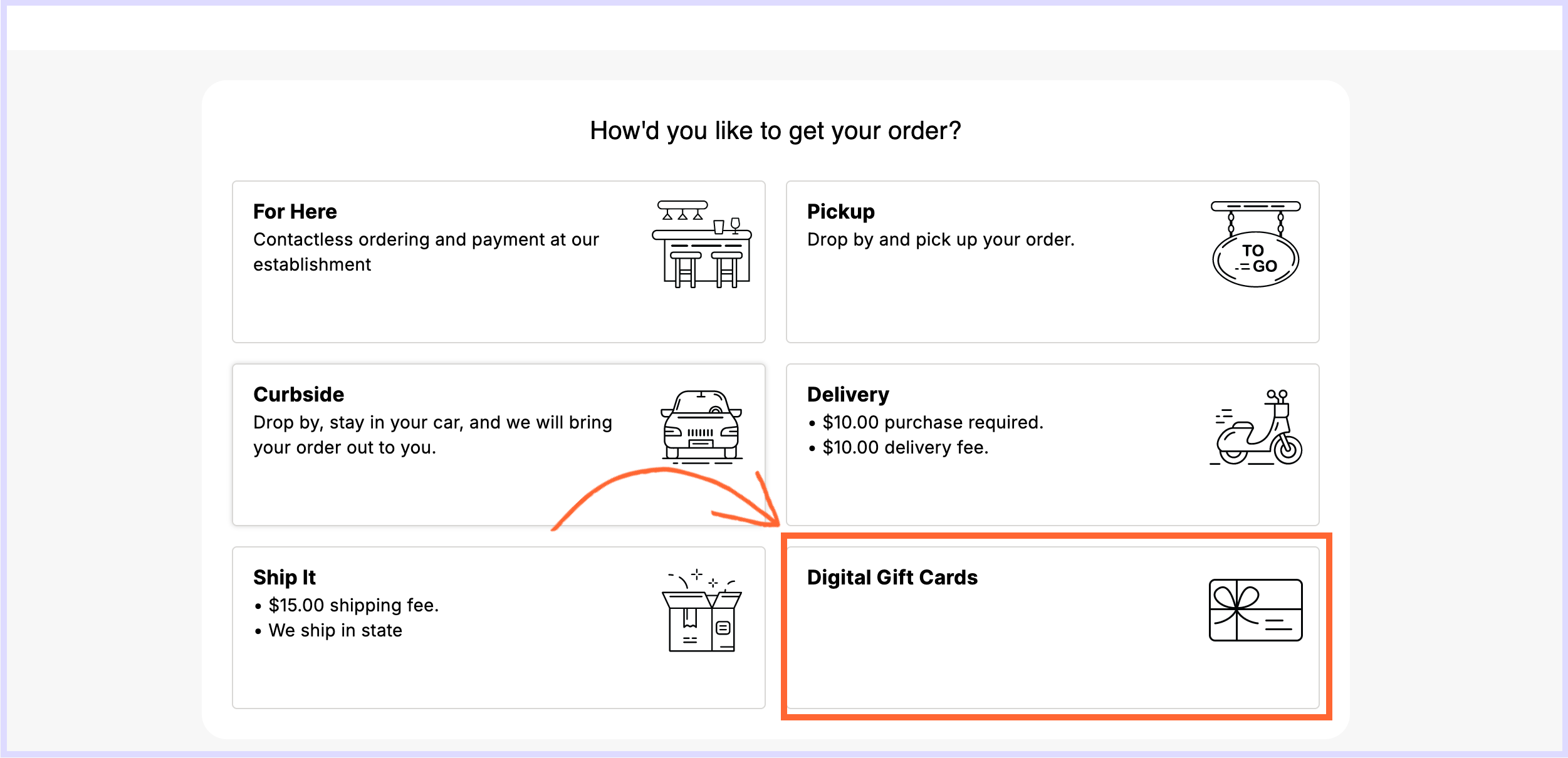 This will add a new ordering modality to your Arryved Online Store and your gift card Item will be there. The Gift Card will not appear on any other online menus.