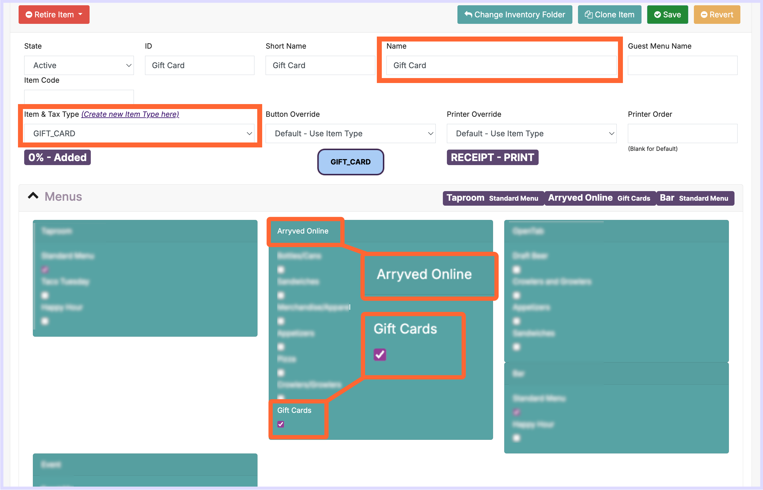 In this step, you’ll create an Inventory Item for your Gift Cards and add it to one of your Arryved Online menus. You can use this same Gift Card Item to sell physical Gift Cards in-person and Digital Gift Cards online.