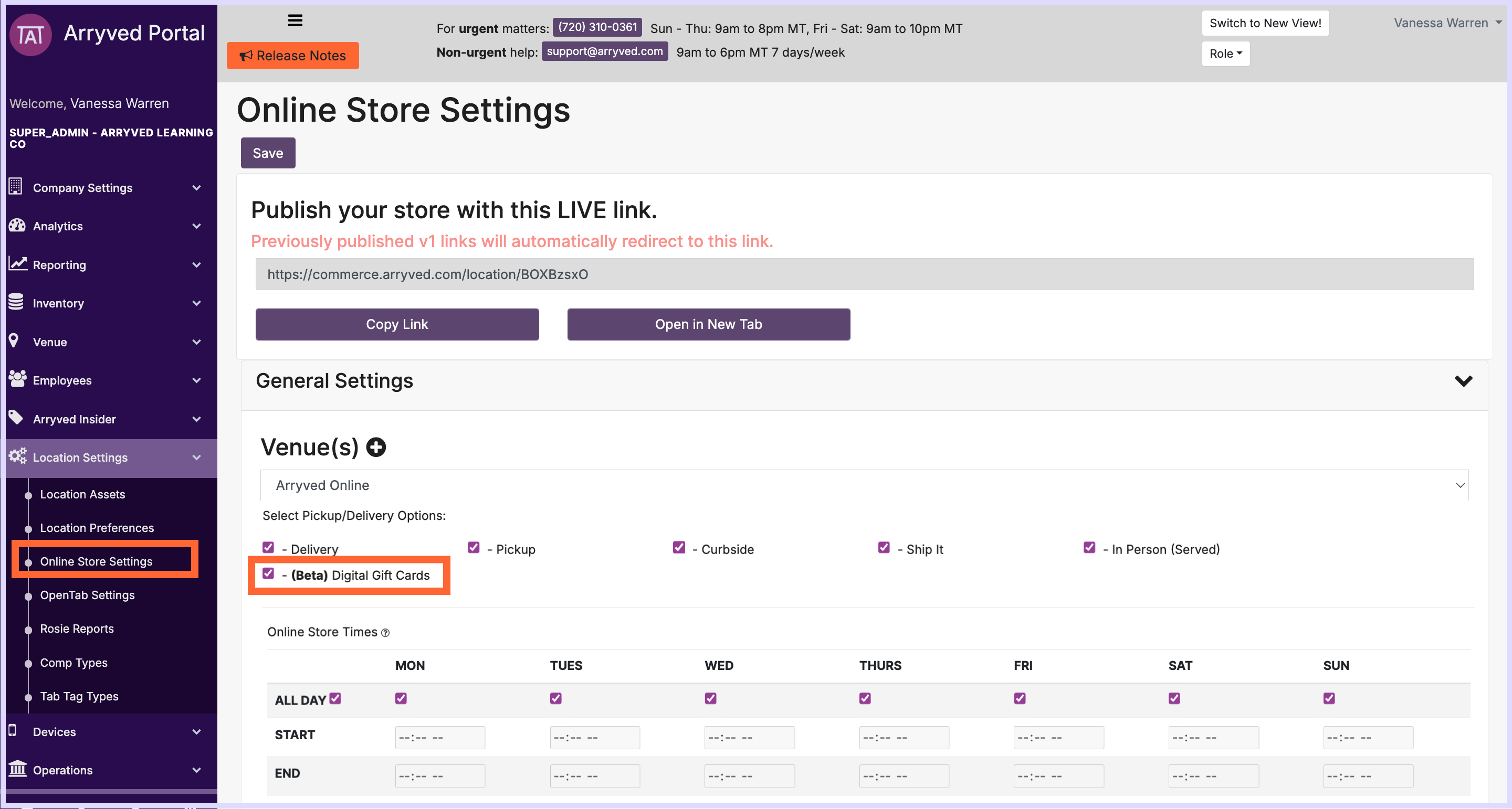 Make sure your “Arryved Online Store” Location Preference is enabled.