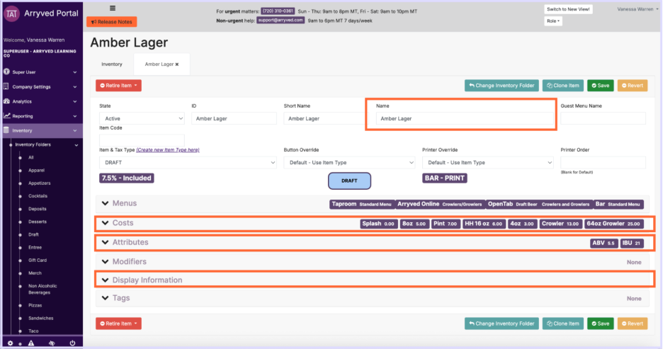 If you need to make a change to any of the Item’s components, you may do that on its Inventory Item page in your Arryved Portal.