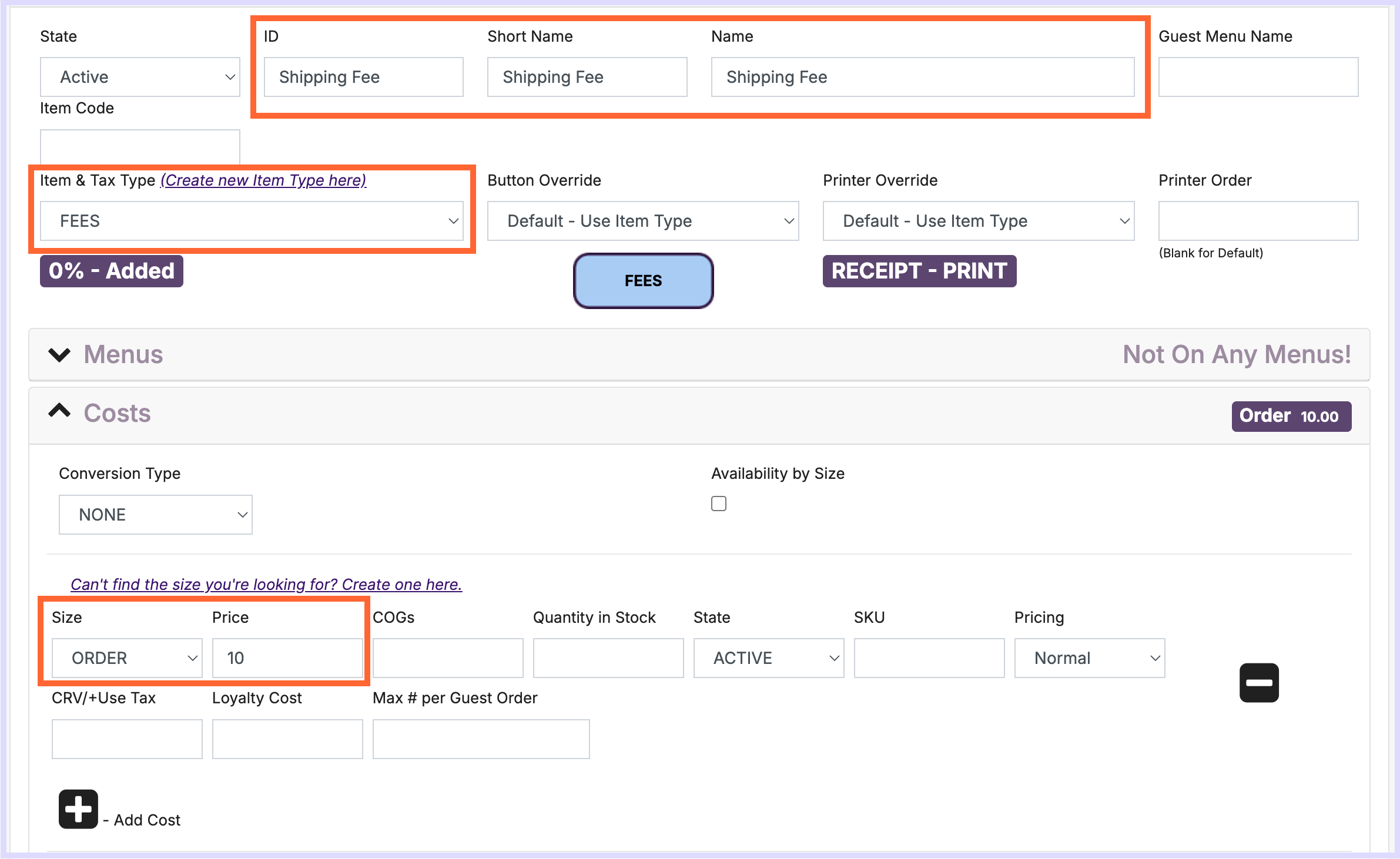 We strongly encourage you to create a new Item Type for your Arryved Online Fees (Shipping Fee and Delivery Fee). This helps keep your reporting neat and tidy, and you’ll want a 0% Tax Type applied to it.