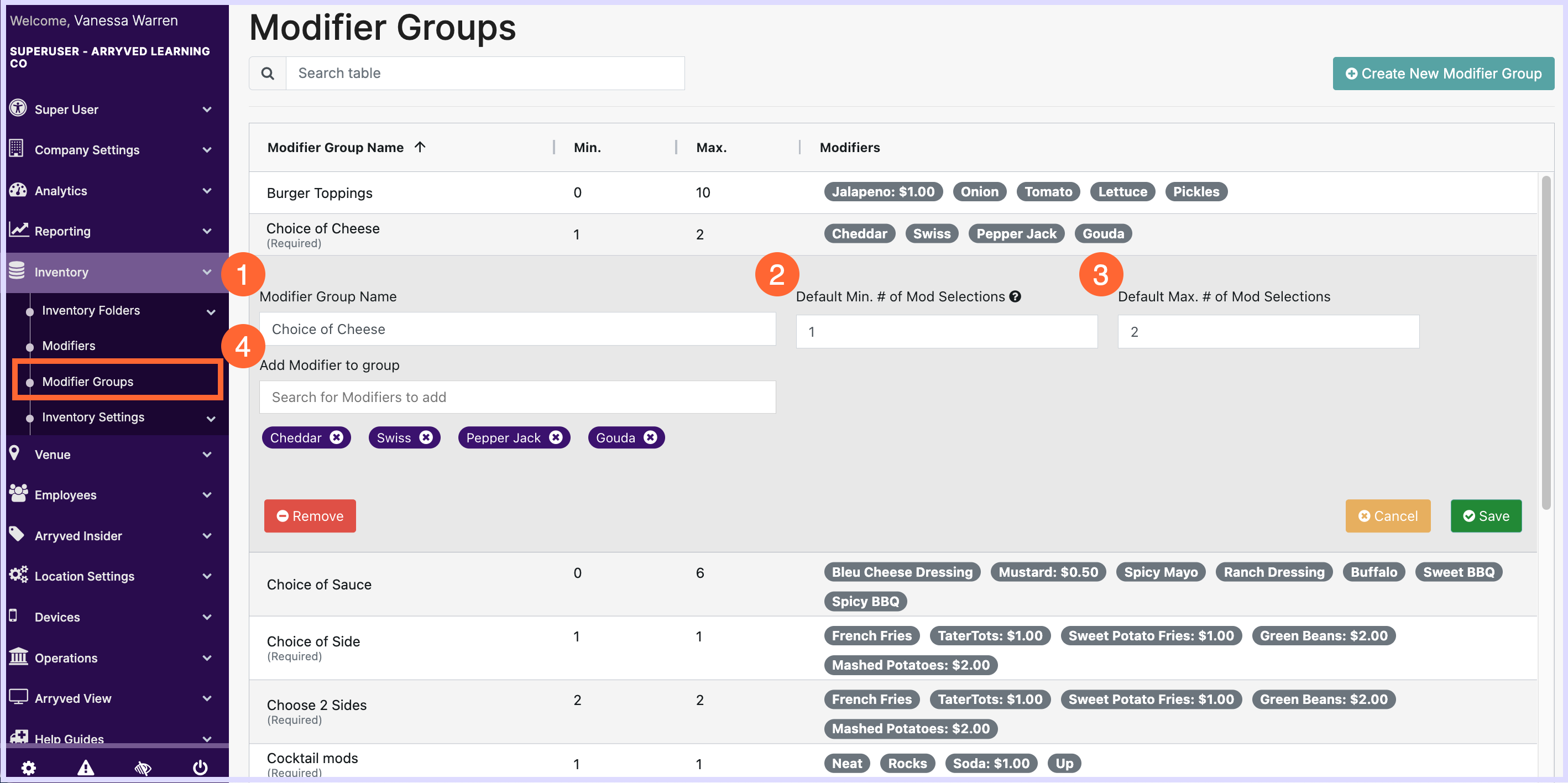 To create or edit Modifiers, you must be an Arryved Portal Super Admin or an Admin with one of the following Portal Permissions: