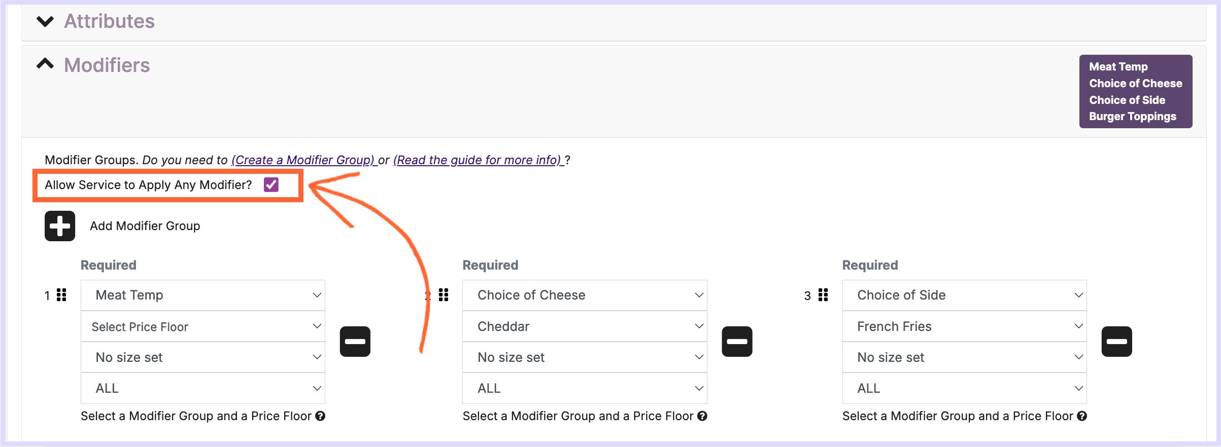 Pro Tip! If you want to rearrange the order of the Modifier Groups for this Item, you can click and drag the icon made of 6 squares to each one to move them. The order they appear here is how they’ll appear to staff and guests when they order this Item.