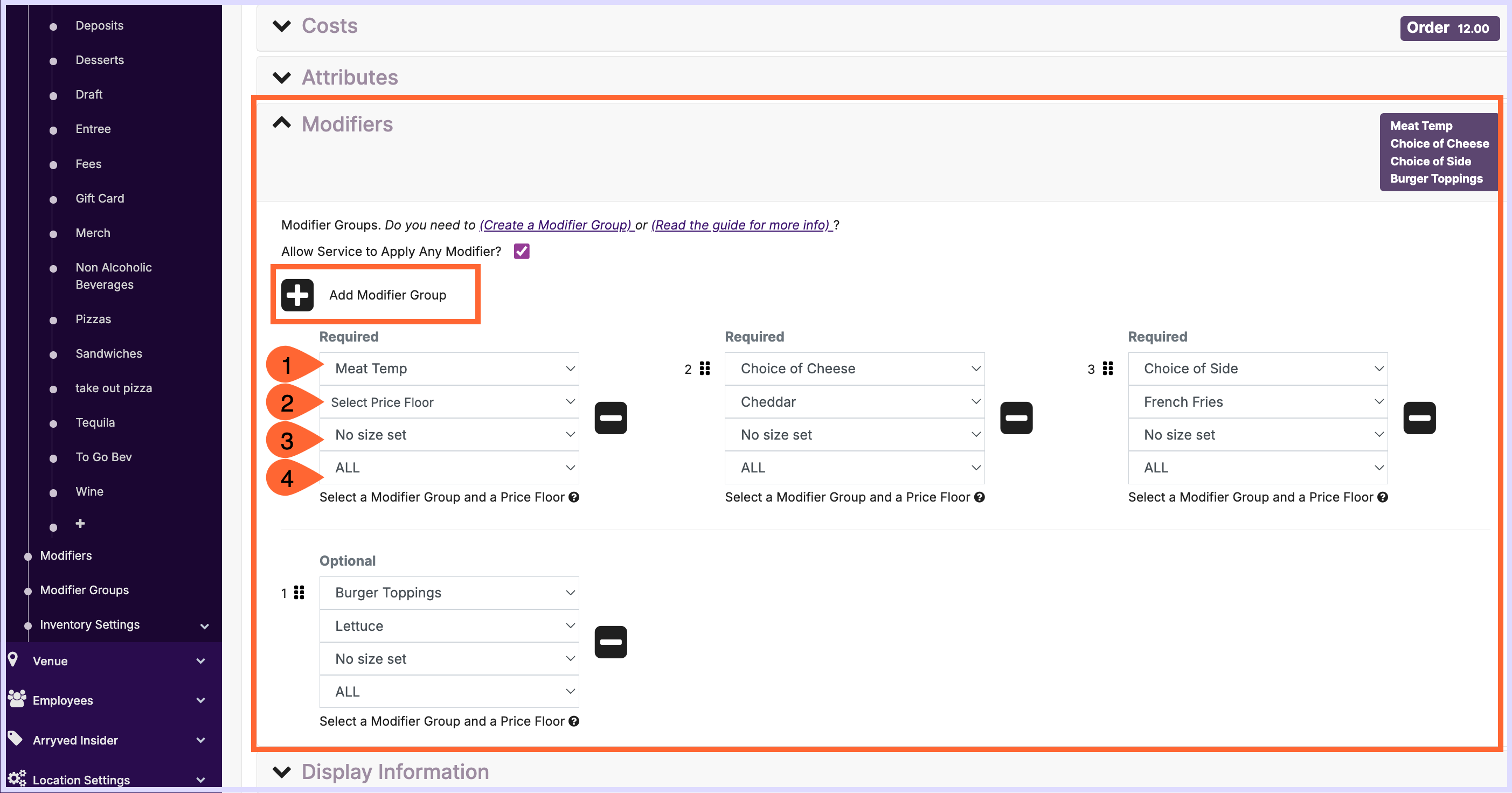 2) Select Price Floor: Use the Price Floor tool if you want to adjust your upcharges for this item. By selecting a specific Modifier as the Price Floor, you’re allowing any Modifiers with equal or lesser value to be added to this Item for no extra cost. Any Modifier that has a higher upcharge will apply the difference in price to the Item.