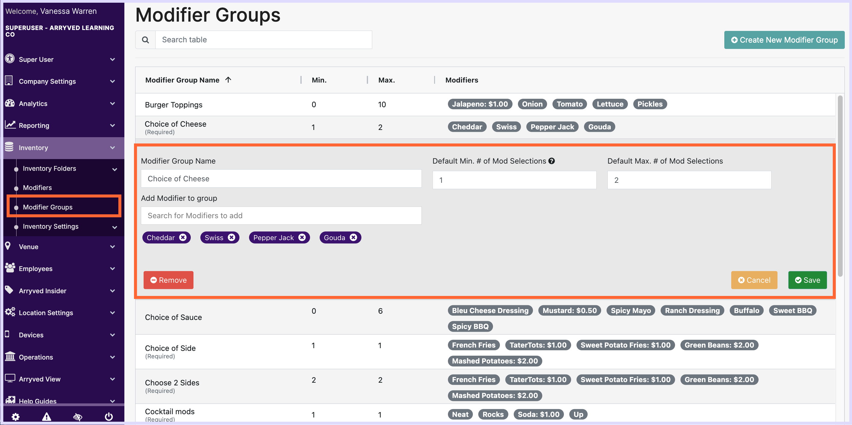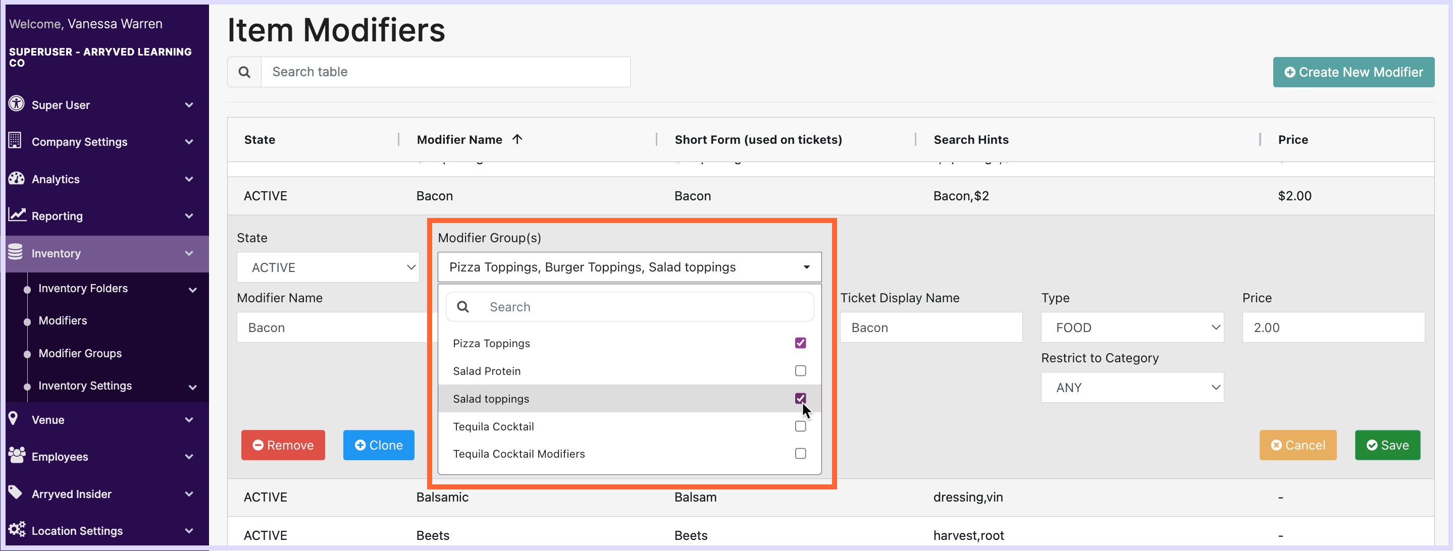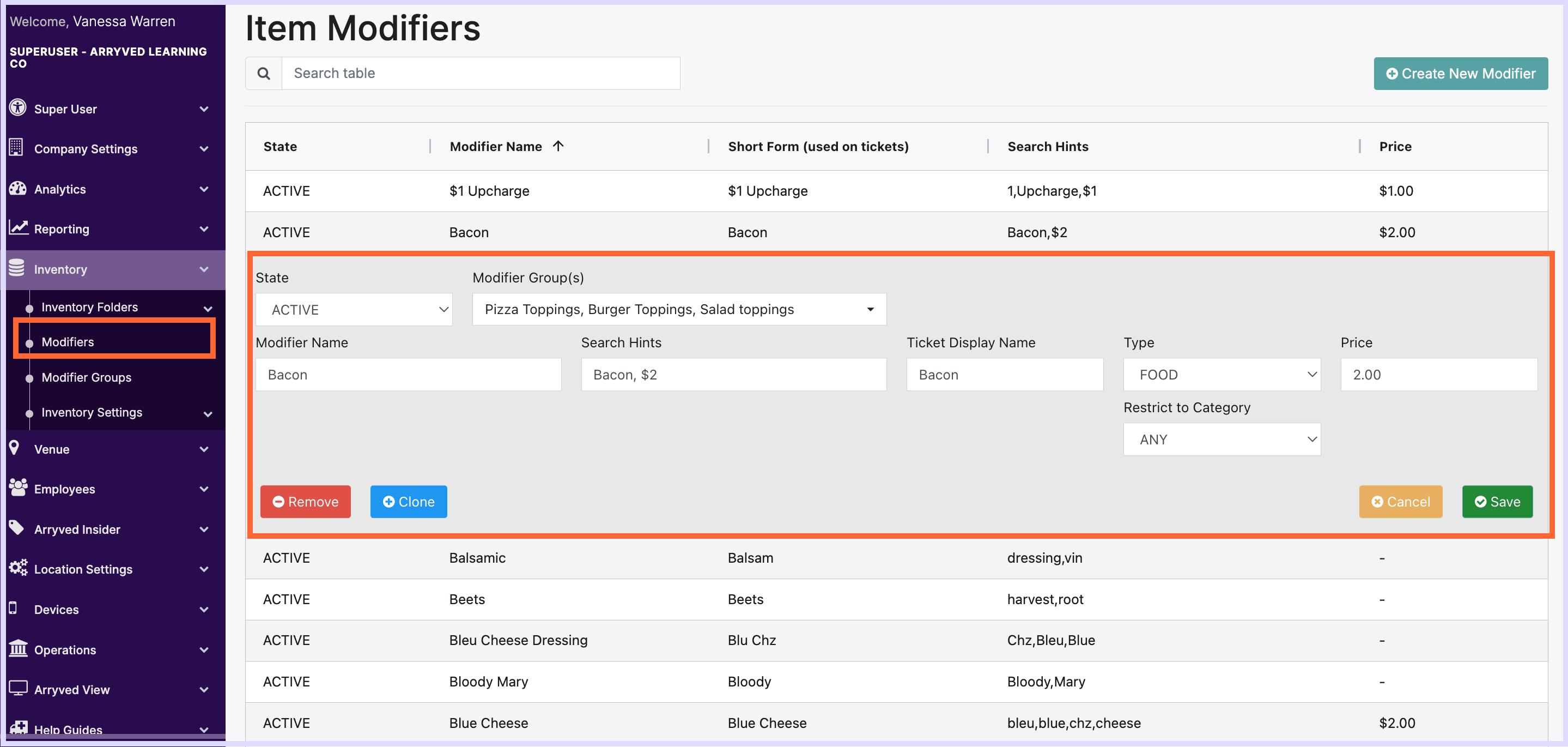 To create or edit Modifiers, you must be an Arryved Portal Super Admin or an Admin with one of the following Portal Permissions: