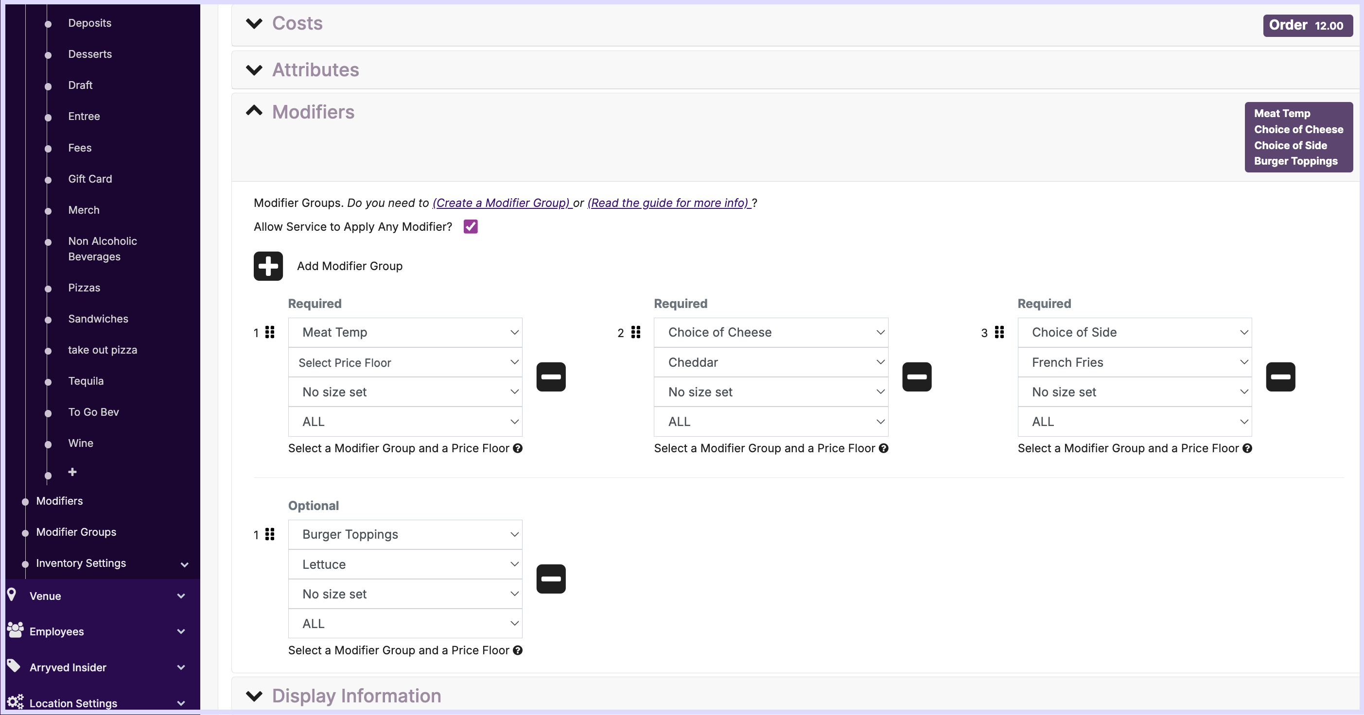 “Modifier Groups” let you group Item Modifiers together for easy ordering. You can then add any of those Modifier Groups to any Inventory Items, so that staff and guests are prompted to make the necessary choices to go with those Items when ordered.