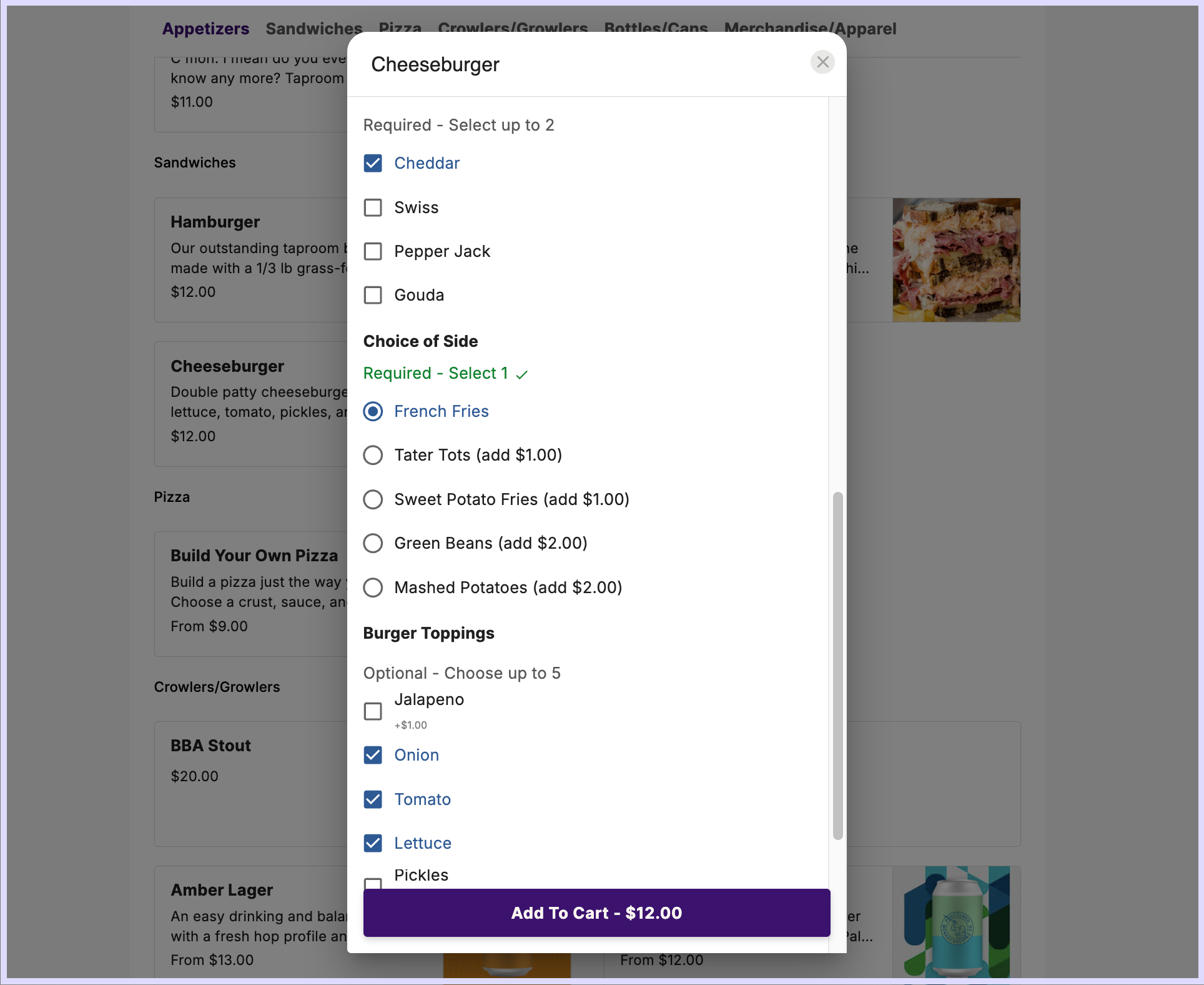 Required and Optional Modifier Groups are clearly presented to guide guests through the right choices when ordering through OpenTab and Arryved Online.