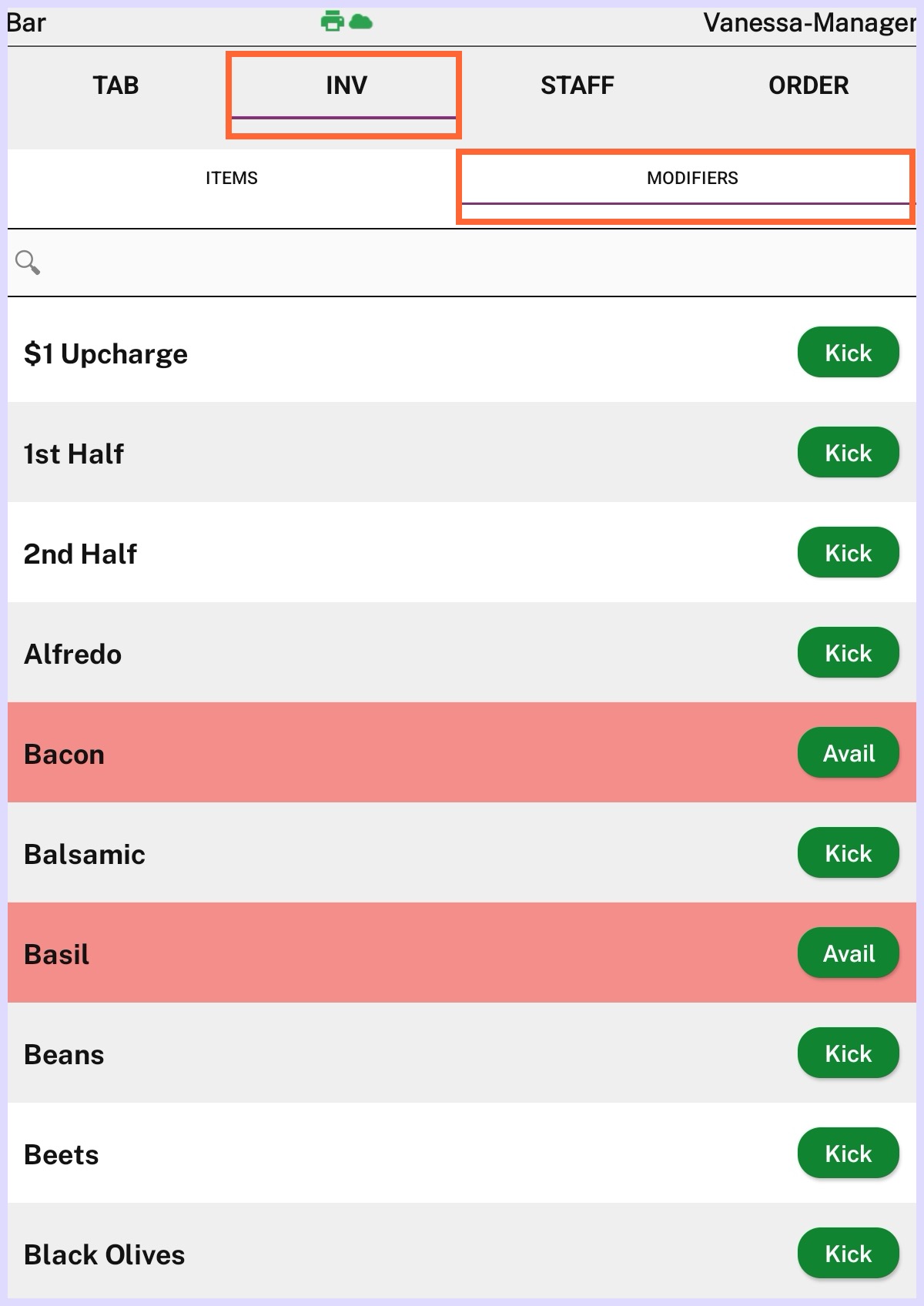 From the INV screen in Arryved Service, users can kick Modifiers that are currently unavailable so they can’t be ordered. When a Modifier has been restocked, users can make it available again from the same screen.