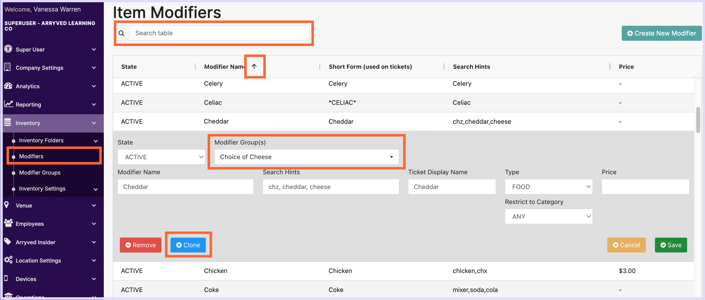We added a few enhancements to the Item Modifiers page in your Arryved Portal, too.