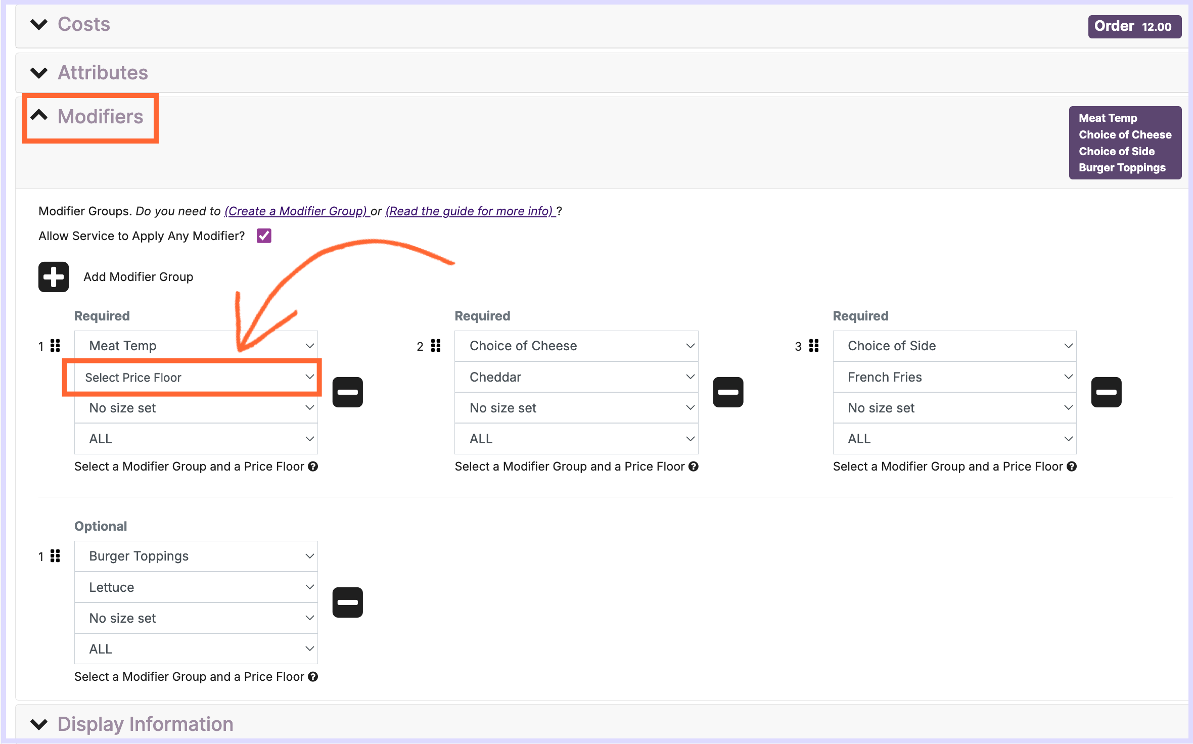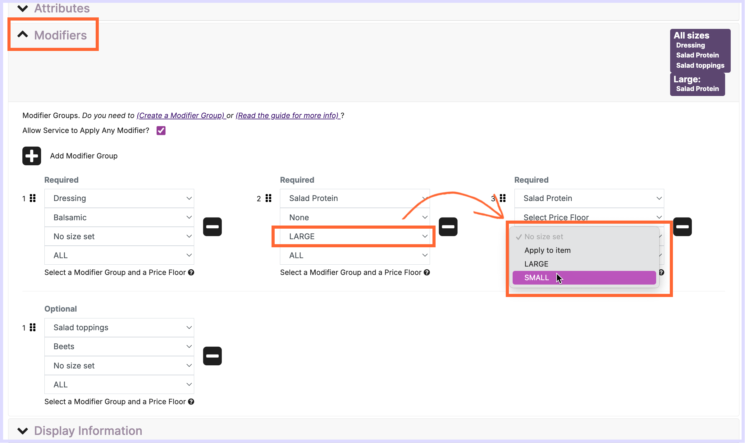 Optional Modifier Groups can be added to Items for convenience when ordering but aren’t required to select from.