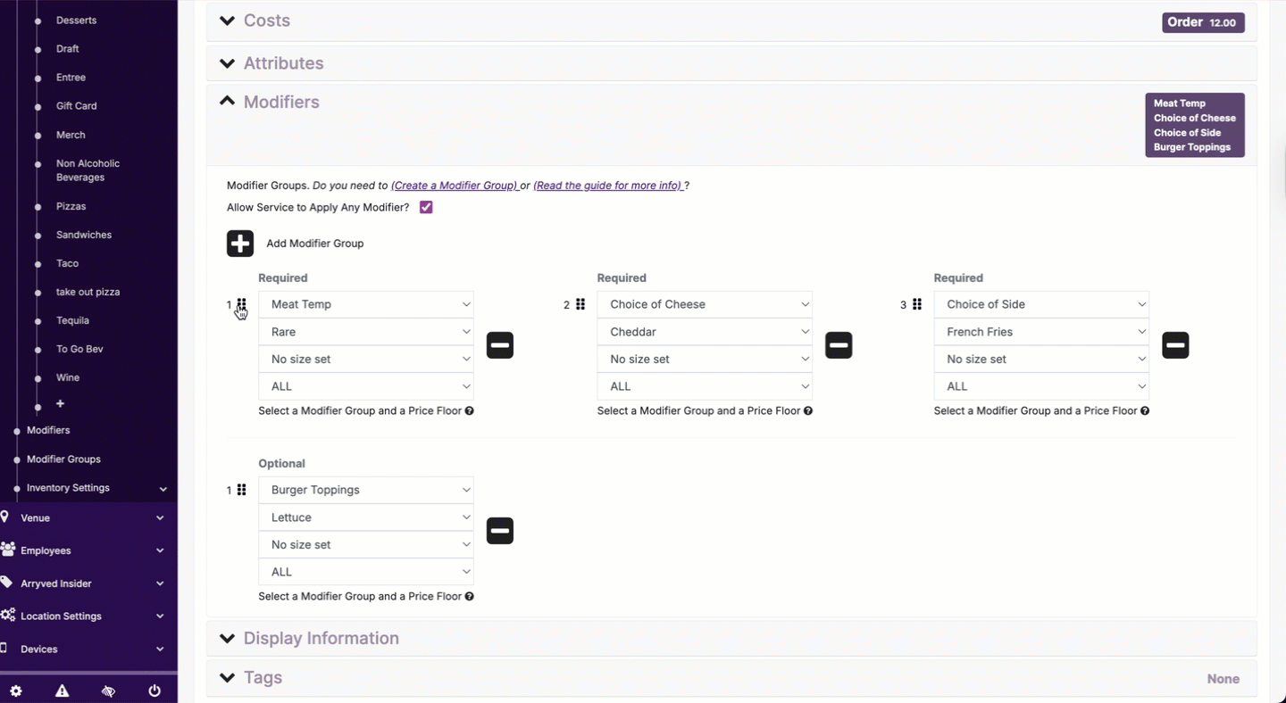 Click and drag the 6 dots to the left of Modifier Groups to rearrange the order. How they appear here is how they’ll appear to staff in Arryved Service and guests ordering through OpenTab or Arryved Online.